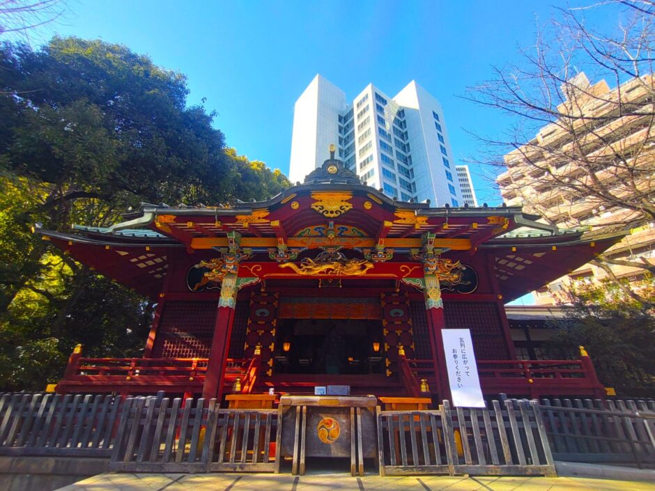 渋谷駅近くの町中にある神社で宮益坂の途中の路地を入ったところにあります。周りは商業ビルやマンションにかこまれ、ここに神社があるのか・・・と思うところにあります。徳川家光が将軍になることを祈願し成就したという故事から、ビジネスマンの立身出世、昇進のご利益があるとされ、比較的ビジネスマンが多く参拝しているようでした。