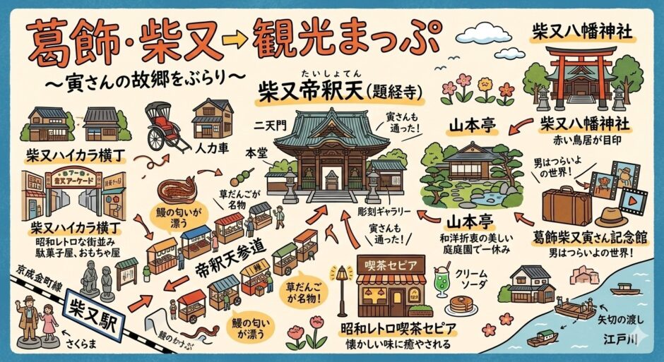 東京都葛飾区、江戸川のほとりに位置する「柴又」は、東京にいながら昭和のノスタルジーと江戸時代からの深い信仰が共存する、まさに「日本の心のふるさと」です。柴又帝釈天を中心に、映画『男はつらいよ』の世界観と、風情ある庭園、レトロな路地裏を欲張りに巡る半日散歩コースとなります。